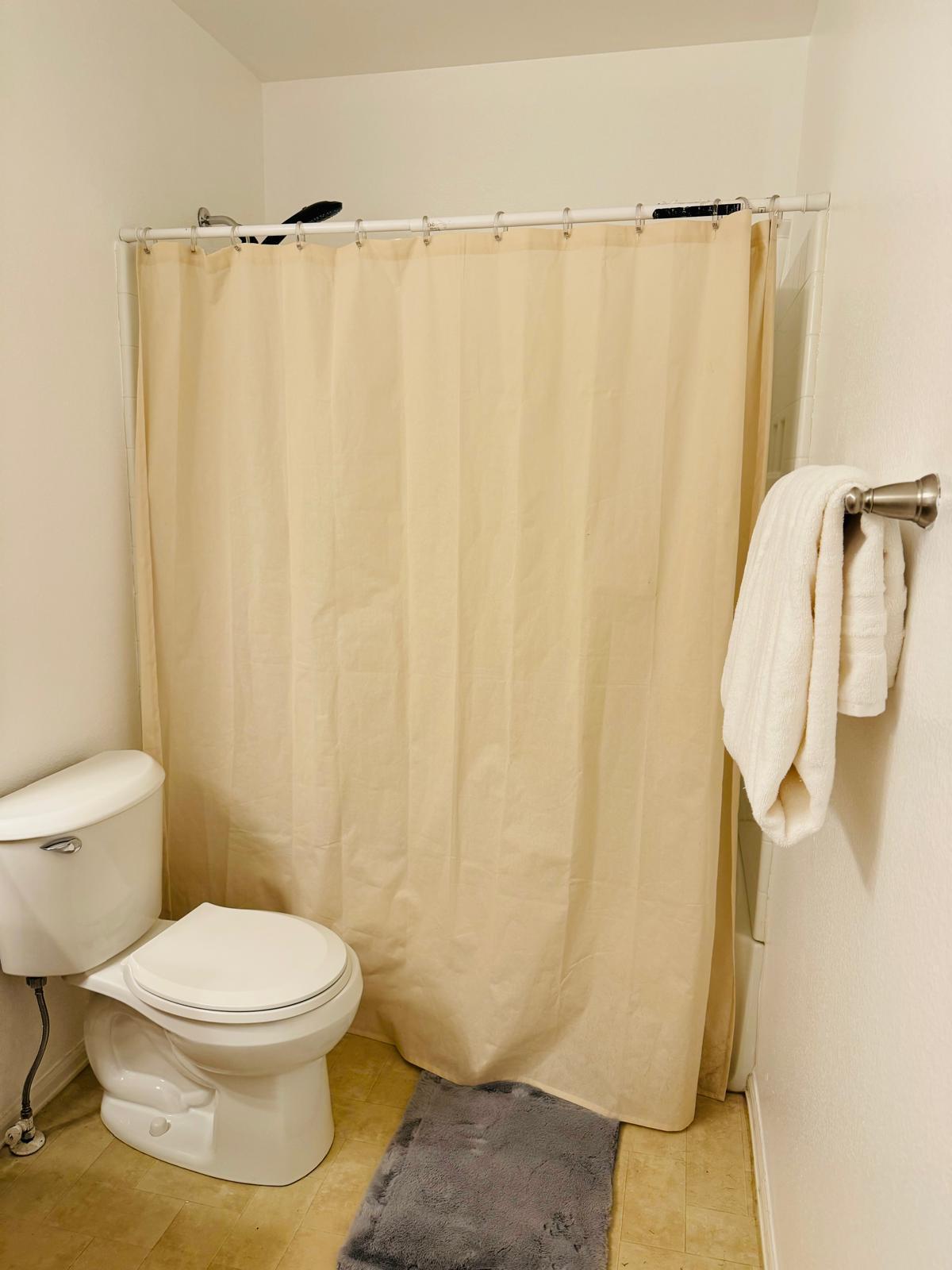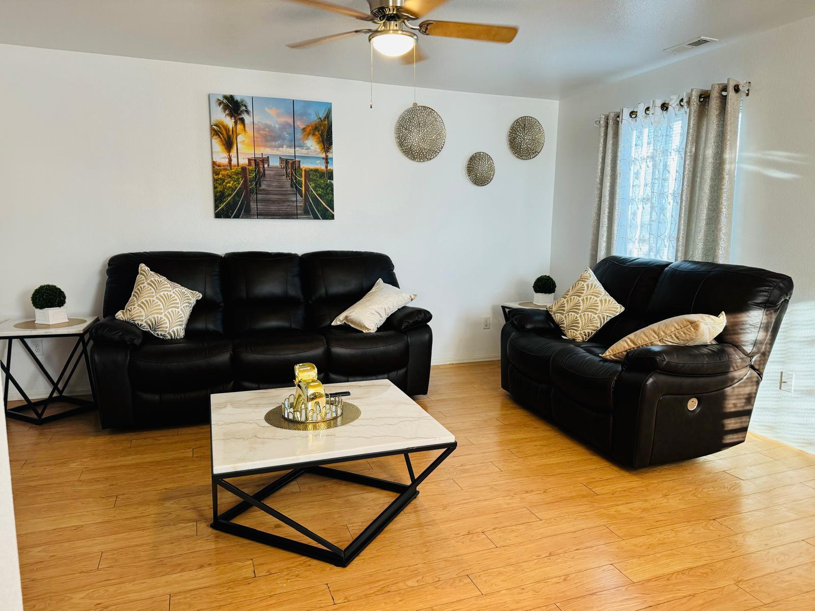 The home features three well-sized bedrooms with comfortable beds, fresh linens, and storage space to help you settle in easily. A bright living area provides a relaxing spot to unwind after a busy day—ideal for movie nights, catching up with friends, or simply enjoying a quiet evening indoors. The bathroom is clean and functional, with fresh towels and essential toiletries provided.